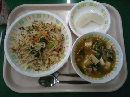 今日の給食は、ビビンバ、豆腐のチゲ風汁、梨、牛乳です。今日の梨は栃木県産の「にっこり」という品種です。栃木で有名な「日光」と、「梨」を「り」とも読むことから、2つを合わせて「にっこり」という名前になりました。