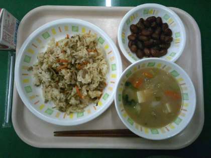 今日の給食は、豚肉とごぼうのごはん、いわしのつみれ汁、煮豆、牛乳です。いわしのつみれ汁は、いわしのすり身にしょうが、ねぎを入れて臭みを消し、一つずつ釜に入れて作りました。いわしのだしがたっぷり出た温かい汁物は、今日のように寒い日にはぴったりのメニューです。
