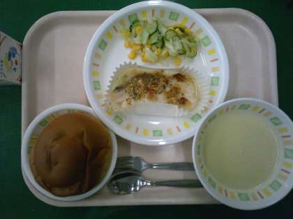 今日の給食は、黒砂糖パン、魚のアーモンド焼き、コーン入りフレンチサラダ、さつまいものポタージュ、牛乳です。スープに使ったさつまいもがとても甘く、おいしいポタージュができました。