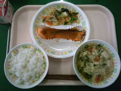 今日の給食は、ごはん、鮭のもみじ焼き、千草和え、かきたま汁、牛乳です。紅葉したもみじのように、色を赤く仕上げた料理を「もみじ焼き」と言います。今日は、鮭の上に、甘いみそだれとにんじんのすりおろしを混ぜたものをのせて焼きました。にんじんが苦手な人でも、食べやすいメニューです。