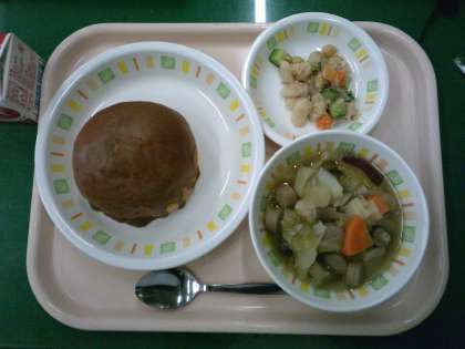 今日の給食は、ココアビスキュイパン、秋色ポトフ、ビーンズサラダ、牛乳です。秋色ポトフには、きのこやさつまいもが入っています。ポトフはどんな野菜でも作れるので、季節に合わせていろいろなアレンジを楽しんでみるのもいいかもしれません。