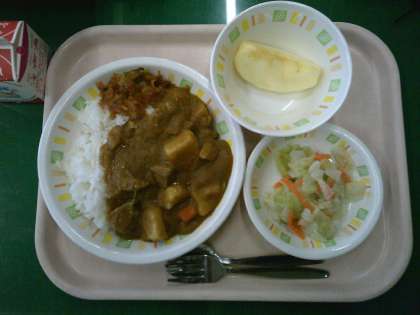 今日の給食は、カレーライス、福神漬、キャベツサラダ、りんご、牛乳です。給食では大きなお釜2つを使って、カレーを作っています。1つは低学年用の辛さ控えめカレー、もう1つは高学年用です。学校給食は、カレールウも手作りなので、香辛料の量を調整し、少しだけ辛さを変えて作っています。