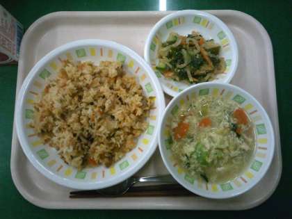今日の給食は、キムチチャーハン、トックスープ、わかめサラダ、牛乳です。トックとは韓国語で「汁物に入っているもち」のことです。日本と同じように、韓国でももちはよく食べられています。日本のもちはもち米で作りますが、韓国のもちはうるち米から作られます。そのため、粘りや伸びは少なく、歯切れがよいのが特長です。