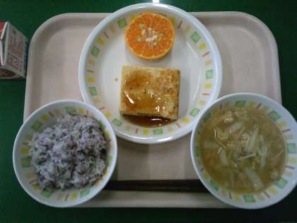今日の給食は、ゆかりごはん、擬製豆腐のあんかけ、白菜のみそ汁、はやかです。今日の果物は早香(はやか)と言います。みかんとぽんかんのかけあわせで、むきやすく、とても甘い果物です。今しか食べられない旬の味です。