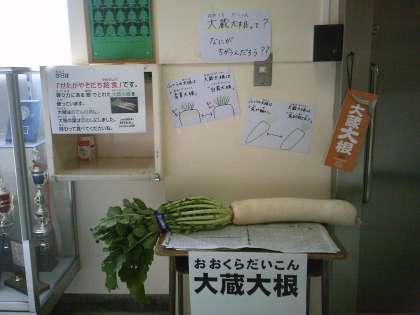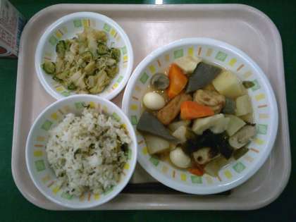 今日の給食は、菜めし、大蔵大根のおでん、野菜のじゃこあえ、牛乳です。今日は「せたがやそだち」給食です。「せたがやそだち」とは、世田谷区内で生産された野菜や花のブランドです。今日の給食では、等々力にある畑で収穫された大蔵大根を使って、菜めしとおでんを作りました。今日の給食のために、夏から大切に大蔵大根を育ててくださいました。今日は、給食室の前にも大蔵大根の展示をして、子どもたちにも紹介をしました。