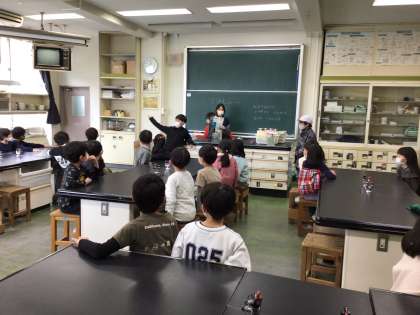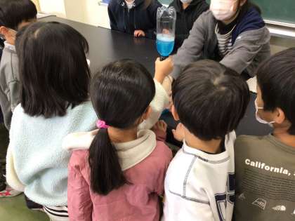 休み時間に、理科委員会のみなさんが、「おもしろい 水のりかじっけんショー」を開いてくれました。水のトルネードをつくる実験や曲がる水の実験を教えてもらい、実際に体験してみると、その不思議さに驚く姿が見られました。