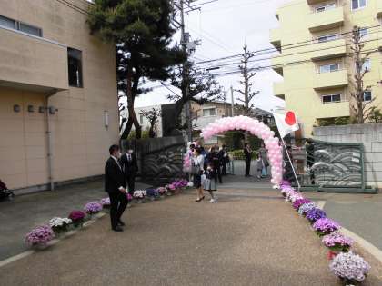 おやじの会のみなさんが設置してくれた、入学をお祝いするバールーンアートの門が、新一年生をお迎えするところから始まった入学式。