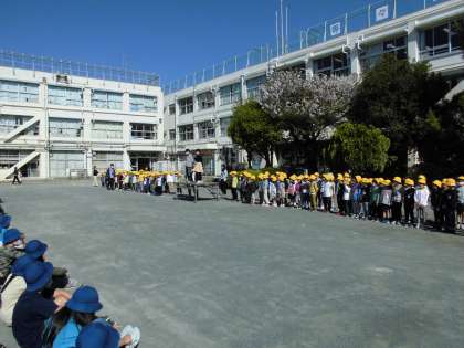 112名の新入生を迎え、2年生から5年生の前に並んでもらいました。