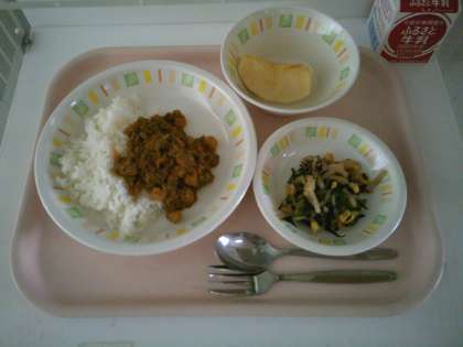ひよこ豆のカレーライスは、野菜をみじん切りして炒めて調味料を加えて煮込み、やわらかく茹でたひよこ豆を入れて煮込みました。レンズ豆も入っています。ひよこ豆は、まるまるとしていて、ぴよっとひよこのしっぽのような部分がある形をしているので、ひよこ豆と呼ばれているそうです。レンズ豆はレンズのように平べったい形の豆です。