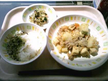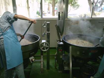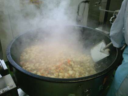今日は、大きな回転釜2釜で「塩にくじゃが」を作りました。いつもの肉じゃがは、しょうゆとお砂糖で味付けをしていますが、今日の「塩肉じゃが」は、塩だけで味付けをしています。鰹節の出汁とお肉や野菜の出汁がしみて、とっても美味しく仕上がりました。ごはんとの相性もバッチリでした。5年生の教室では、おかわりの行列ができていました。