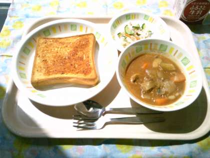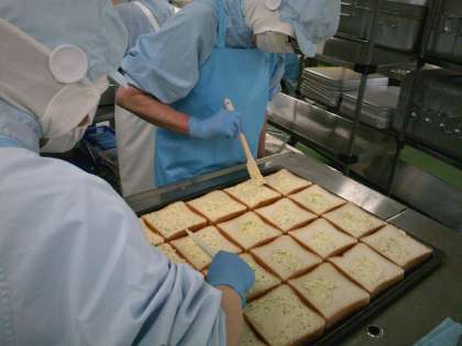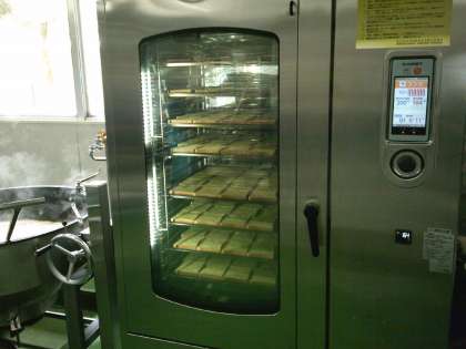 ガーリックトーストは、すりおろしたにんにく、バター、粉チーズ、みじんぎりしたパセリを混ぜ合わせて、食パンに塗ってスチームコンベクションオーブンで焼きました。焼き上がると、とってもいい香りが給食室に広がりました。味も香ばしくて美味しくできました。ビーンズシチューには、白インゲン豆をやわらかく茹でてから、混ぜ合わせて煮込みました。給食室特製のブラウンルーは、油とバターと小麦粉をじっくり炒めて作りました。ビーンズシチューもとっても美味しくできあがりました。
