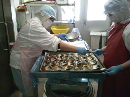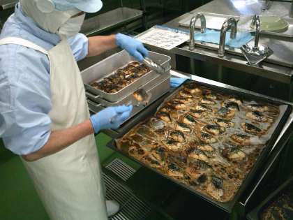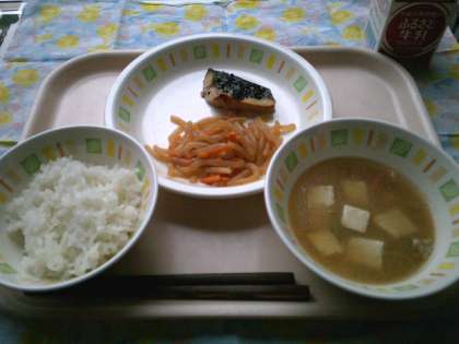 今日は和食メニューです。お米だけで炊いたご飯です。等々力小学校の給食のお米は、山形県産の「はえぬき」というお米を使って炊いています。毎週お米農家から届けてもらっています。粒がしっかりしていて、粘りけが少なめで、冷めてもおいしいごはんに炊きあがります。