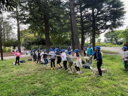 スタンプラリーのチェックポイントは6箇所。それぞれの場所でミッションがあります。みんなで縄跳びやったり、ぶた公園のぶたさんの特徴を班の人数分見つけてきたり、先生を笑わせたり、班ごとに協力し合ってみんな頑張ってます。