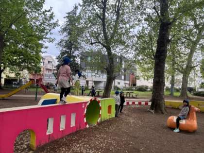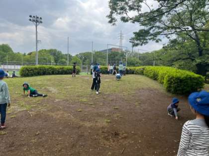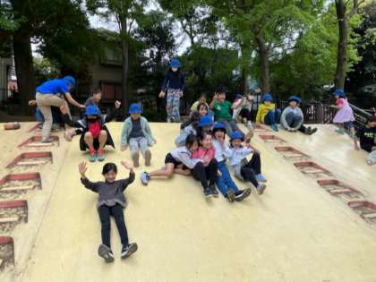 おいしいお弁当を食べたあとは、それぞれクラスごとの遊び。だるまさんが転んだ、大きな滑り台など遊具での遊び、鬼ごっこなどさまざまな遊びで楽しんでいます。雲行きが怪しくなってきました。帰校まで降りませんように。