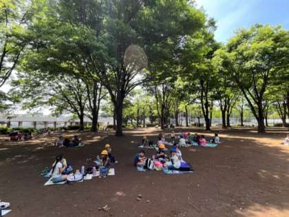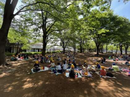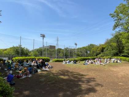 午前中たくさん遊んだ子どもたち。待ちに待ったお弁当タイムです。担任の先生がお弁当タイムですよ。と言うと、一斉にやった〜!と声があがりました。1年生と2年生仲良くグループごとに食べています。朝早くからお弁当、荷物の準備ありがとうございました。