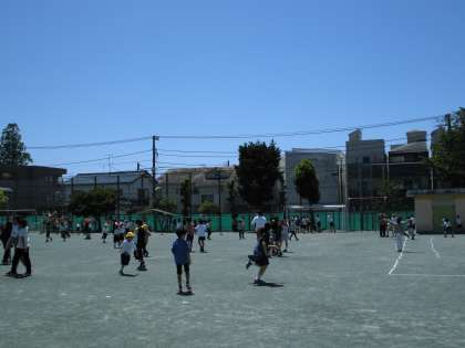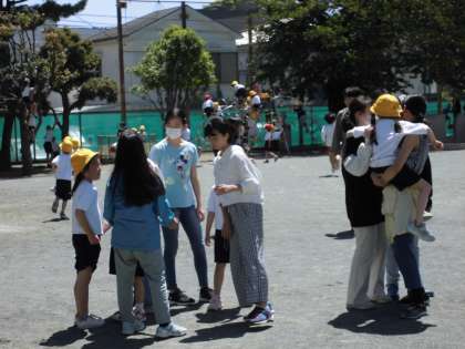 今日は朝から快晴。中休みにはみんな校庭に出て元気に遊びました。1年生のお手伝いで仲良くなった6年生は、一緒に遊んでくれています。6年生に抱っこされて、ニッコニコ。
