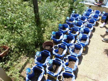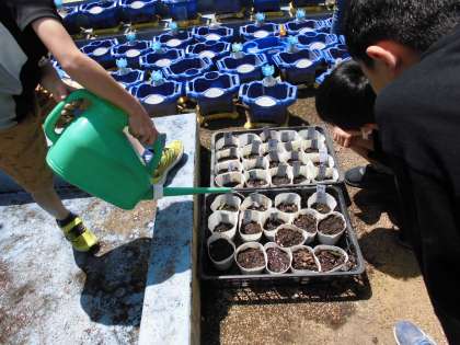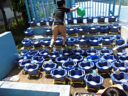 3年生は理科の学習で、ホウセンカとヒマワリを育てています。昨日と今日は天気がよく、明日から2日休みなので、たっぷりと水をあげていました。ヒマワリは2枚のかわいい子葉が出始めました。週明けにはもっと変化があるかもしれませんね。これから観察を続けていきます。