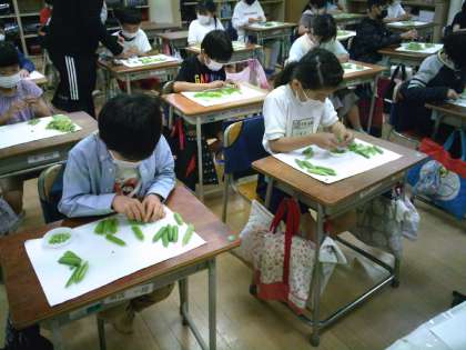 今日は、さやつきのグリンピースを届けてもらい、3年生にさやむきをしてもらいました。3年4組の教室で栄養士より旬の話やグリンピースの仲間の話や、さやから豆をとりだす方法を話しました。1組から3組のみんなには、オンラインで、中継しました。さやむきのときには、色や匂いや大きさ、何粒入っているかなど、観察してみるように伝えました。子どもたちからは、つるつるしているもの、ざらざらしているものがあった、とか、最大9個入ってた!とか、楽しかった〜!という感想が聞けました。