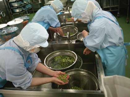 さやむき後のグリンピースは給食室で3回水でよく洗い、調理しました。甘くてホクホクでおいしいグリンピースごはんが出来上がりました。