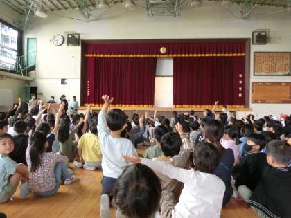 たくさん手を挙げて、こたえる子どもたち。特に、初めての集会に一年生は、大興奮。