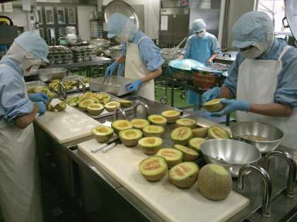 今日のデザートは、今年初の「メロン」でした。茨城県産の「アンデスメロン」でした。とっても甘くていい香りがしてジューシーで美味しいメロンでした。これから、夏にかけてがメロンの収穫時期です。水分と甘味で、運動会の練習で疲れた体が元気になるといいなと思いました。ピクルスは、、きゅうり・にんじん・だいこん・セロリを甘酢と和えて作りました。パリポリとした食感が美味しく仕上がりました。苦手な子も多いセロリも入っていましたが、おかわりをしている子もいました。