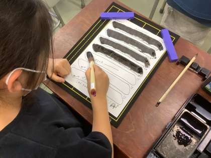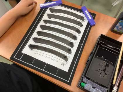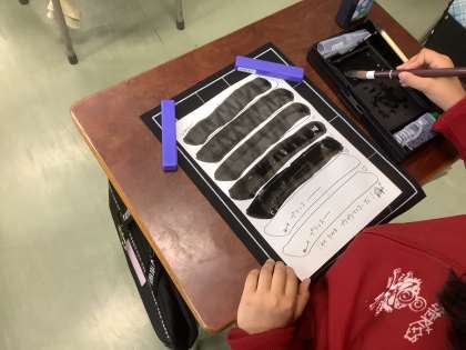 3年生は、初めて毛筆の学習に取り組みました。最初の作品は、漢字の「一」を書きました。穂先の向きや、筆を握る力加減に苦戦しながらも、お手本をよく見て作品を仕上げる様子が見られました。「『一』は簡単だと思ったのに、難しかった。」「もっと難しい文字にも挑戦してみたい。」などの声が上がり、毛筆の難しさや楽しさを感じていました。