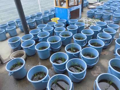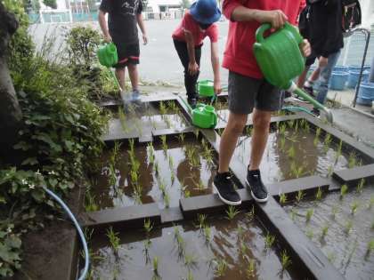 先日田植えを終えた5年生。その稲の苗が少しずつ成長しています。5年生の子どもたちは田んぼが干上がらないように、毎日確認して水やりのお世話をしています。無事に稲が成長し、秋にお米を収穫できるといいですね。