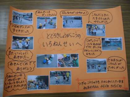 先日ご紹介した1年生と幼稚園、保育園の子どもたちとの交流会ですが、今日は、三島幼稚園の先生が、そのお礼に写真入りのお手紙を届けてくれました。嬉しい感想がたくさん書かれています。幼稚園・保育園との交流は、等々力小学校の特色ある教育活動ですし、キャリア教育にもつながる素晴らしい活動です。この手紙を読んだときの1年生がどんな表情をするか楽しみです。
