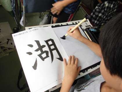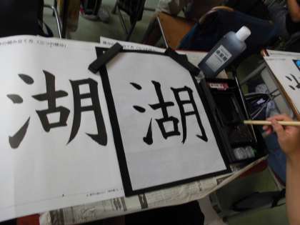 学校公開2日目の今日の午後も、みんな集中して取り組んでいます。6年生は書写の学習「湖」という漢字を心を込めて書いていました。夏休みの日光林間学園では、湯ノ湖、中禅寺湖へ行きます。そんな美しい景色が思い浮かぶ作品でした。
