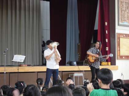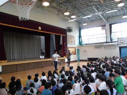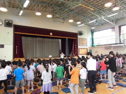 今日はEverly(エバリー)さんをゲストティーチャーにお迎えし、ミニコンサートを開催しました。ディズニーメドレー、トルコ行進曲、ルパン三世などの曲を披露していただき、テキーラでは、会場全体が大盛り上がりでした。一緒にステップを踏んで楽しく聴いたり、リズム遊びをしたり、一緒に参加できる曲もあり、子どもたちは音楽の楽しさ、素晴らしさを更に感じたようです。アンコールでは等々力小学校の校歌を一緒に大合唱。Everlyの皆様すてきなコンサートをありがとうございました。