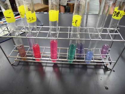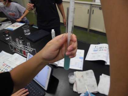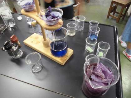 6年生の理科「水溶液の性質」の学習も終盤。今日はムラサキキャベツを指示薬として、身近にある液体の液性を調べていました。凍らせておいたムラサキキャベツを溶かして絞ると簡単に指示薬ができます。アントシアニン色素が含まれているからです。石鹸はアルカリ性、洗剤は中性だねなど、家から持ってきた様々な液体を調べていました。最後には、1本の試験管の中で酸性(赤色)からアルカリ性(緑色)のグラデーションを作ることに挑戦。みんな楽しく学習のまとめをしていました。
