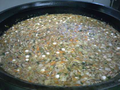 中華丼の具は、たっぷりの野菜と魚介類に、お肉、うずら卵などを、鶏ガラスープと調味料で煮込み、片栗粉でとろみをつけました。