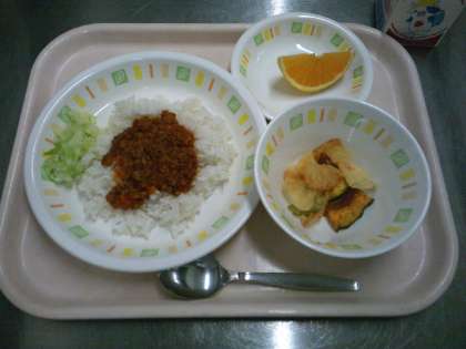 今日は、「旬を食べよう」給食の日でした。夏野菜のかぼちゃ、ゴーヤとじゃがいもを、低温の油でじっくりカリッとなるまで揚げて、塩こしょうをふりました。タコライスは、沖縄生まれの料理で、「タコス」と「ライス」が合わさった「タコライス」です。ごはんの上に、タコスのミートソースと茹でたキャベツをのせました。タコスは、チリパウダーを入れたのですが、辛味が強くなってしまいました。1年生は食べられるか心配していましたが、ほとんどの子が美味しい!食べられた!と言っていました。辛い味が苦手な子は、苦戦していました。3年生でも、辛い!と言っている子がいました。次回は辛さに気を付けたいと思います‼