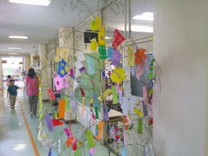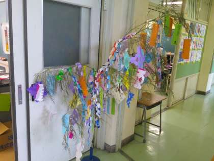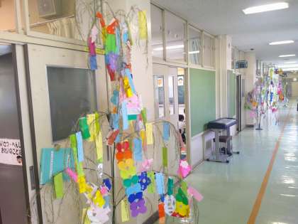 今日は七夕。1年生の教室前には、図工の時間に作った七夕飾りが飾ってあります。地域の方から竹を寄贈いただき、みんなで飾り付けました。ありがとうございました。今夜はきれいな星空が見れますように。