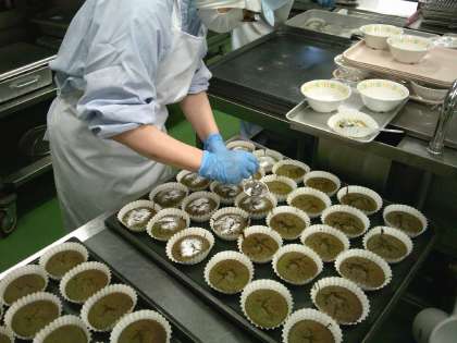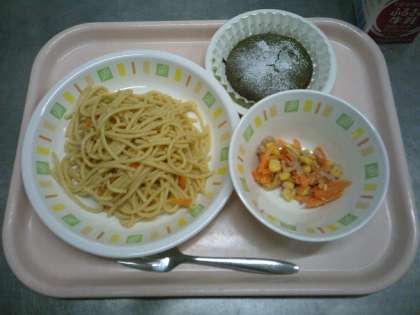 和風スパゲッティは、豚肉と野菜(にんにく、玉ねぎ、にんじん、しめじ、キャベツ)を炒めて白ワイン、塩、こしょう、しょうゆで味付けをして、麺と炒め合わせて作りました。暑い日が続いていますが、ツルツルっと食べやすい麺類にお肉や野菜をプラスして、しっかり食べられる献立です。抹茶のカップケーキは、抹茶が少し大人の味に仕上がりましたが、上にまぶした粉砂糖や甘納豆の甘さとちょうど良く合わさって美味しく出来上がりました。3年生から「苦いのと甘いのが合わさって美味しい!」という声もいただきました。