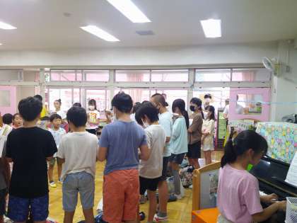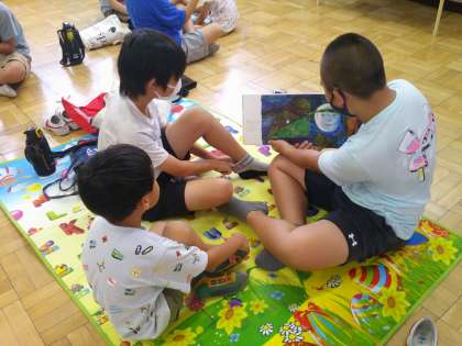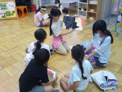 みしまの森学舎の三島幼稚園と等々力小学校の5年生との交流会を行いました。月曜日は年少ゆり組さんと、今日は年長さくら組さんとふじ組さんとの交流です。5年生はこれまで読み聞かせをしてあげる絵本の読む練習をしたり、園児へのプレゼントを作ったり、しっかりと準備をしてくれていました。児童のピアノ伴奏で、「虹」をみんなで歌うところから交流がスタート。自己紹介、読み聞かせと交流していきます。絵本の読み聞かせが楽しすぎて笑いが止まらなくなる園児もいました。みんなのニコニコ笑顔がとてもすてきでした。上手に読み聞かせできた5年生さすがです!