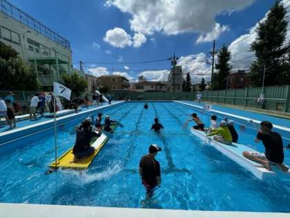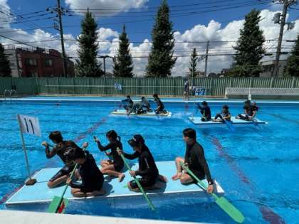 明日はアドベンチャーin多摩川の本番です。今日は午前中におやじの会の皆様から、等々力小チームに最終確認と、プールでいかだを漕ぐ練習をしました。チーム等々力はなんと、全体50艇のうち10艇がエントリーしています。これまでの間、いかた作り運営の準備など、おやじの会の皆様OBの皆様、保護者の皆様など様々な方々にしていただき本当にありがとうございました。明日は子供にとって最高の体験になると思います。どうぞよろしくお願いいたします。