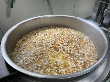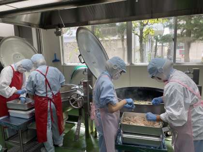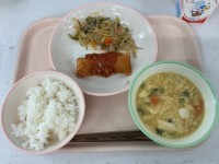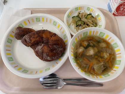 「豆腐団子と春雨のスープ」は、すりつぶした木綿豆腐と鶏ひき肉を混ぜ合わせて、調味料を加えてよく練り、スープにつみ入れて作りました。その数は、およそ2500個以上!調理員さん4人がかりで摘入れてくれました。揚げパンも人気でしたが、スープも大好評でした。