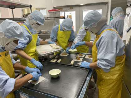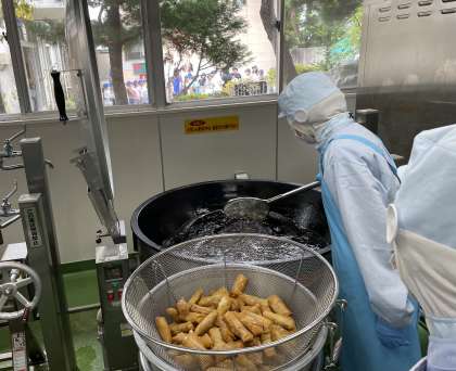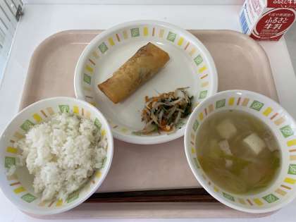 春巻きは給食室で手作りしました。豚肉と野菜、春雨を炒めて、塩、こしょう、しょうゆで味付けした具を、春巻きの皮に包んで、油でカリッと揚げました。具沢山でたっぷりの具を、丁寧に包んでくれました。ボリューム満点の美味しい春巻きが出来上がりました。