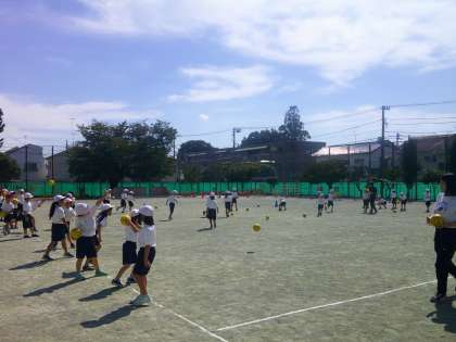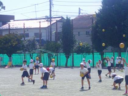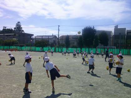 1年生の体育の学習でボール運動を行っています。上に投げてキャッチしたり、遠くへ投げたり、ボールを使った様々な運動をしました。天気もよくみんなとても楽しそうでした。「東京都児童体力・運動能力、生活・運動習慣等調査」の結果でも「投げる」運動は低い傾向があります。体育の学習をきっかけに、休み時間や放課後でもボールを使った遊びが広がるとよいですね。