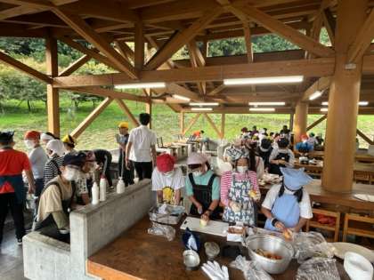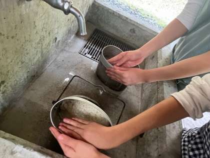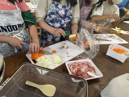 飯盒炊さんスタートしました。まずは調理班。野菜切りと飯盒で米とぎに分かれています。