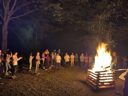 キャンプファイヤーが無事に終わりました。直前に雨が降り実施が心配されましたが、外で行うことができました。森のキツツキさん、ピヨピヨちゃん、猛獣狩りに行こうよ、マッチョマン、ジンギスカン、最後はウルトラソウルをみんなで歌って盛り上がりました。火の神様から分けてもらった火を平和のために使うと約束してくれました。レク係の皆さん盛り上げてくれてありがとうございました。