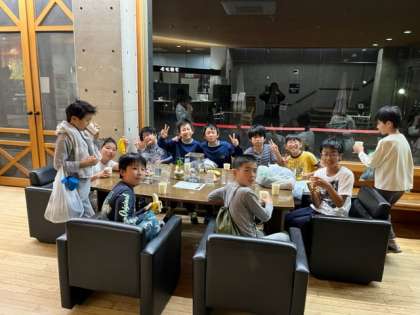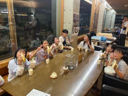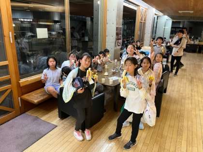 キャンプファイヤーが終わりお風呂に入ってきた子供たち、夕ご飯が早かったので、バナナとりんごジュースでおやつタイム。美味しそうに食べてます。これから就寝準備です。
