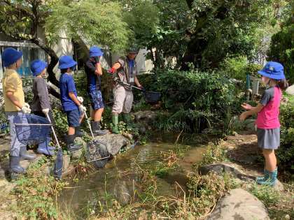 3年生は、総合の時間にビオトープ学習をしました。今日は、ビオトープの管理について、ビオトープギルドの方に話を聞きました。植物が生い茂ってしまうと、日光が当たらなくなってしまうことや、生きものが過ごしにくい環境になってしまうことが分かりました。環境をよくするために、剪定ばさみで枝を切ったり、ビオトープの中の水草をすくったりしました。みなさんのおかげで、様々な生きものが過ごしやすい環境になりました。