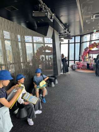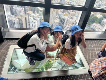 高いところが苦手な子は窓から離れて、大丈夫な子はガラス張りの床の上で楽しんでいます。しっかりと高いところから見た東京都の様子で気がついたことをメモしています。