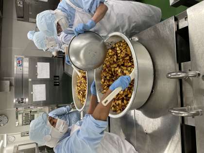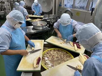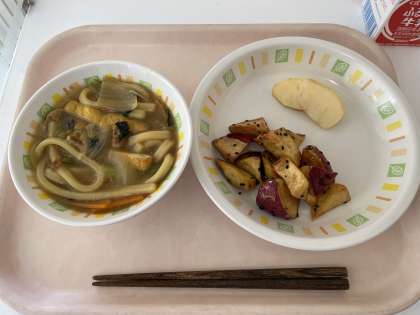今日は旬のさつまいもを使って「大学芋」を作りました。60kg、約150本のさつまいもをよく洗って、調理員さん6人がかりで切りました。油でカリッと揚げて、甘いタレと胡麻を和えました。牛乳との相性ばっちりで、とても美味しく出来上がりました。2時間目ごろから、「今日の給食おいしそ〜」という声があちこちから聞こえてきました。どのクラスもおかわりの行列ができていました。