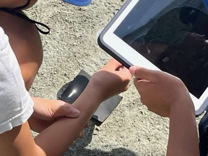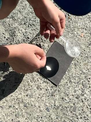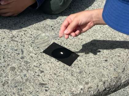 光の性質について学習している3年生。今日は光を集めると温度が上がるのかを確かめるために、虫眼鏡で日光を集める実験をしました。小さな虫眼鏡でも光を1点に集めると画用紙を焦がすくらい温度が上がることにびっくりしていました。