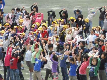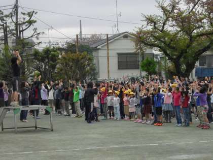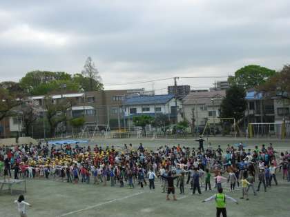 等々力小学校では、毎月1回、朝8時5分からラジオ体操を行い、体力の向上を目指しています。今日は、第1回目のラジオ体操の日でした。たくさんの子が校庭に集合し、心地よい汗をかいていました。5月は18日(金)に行う予定です。