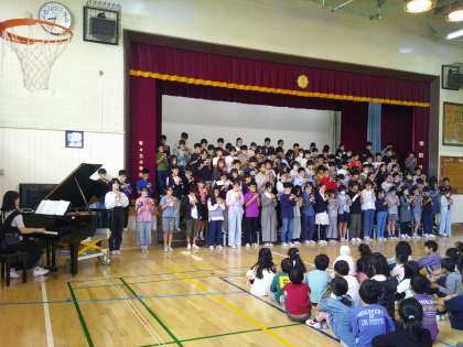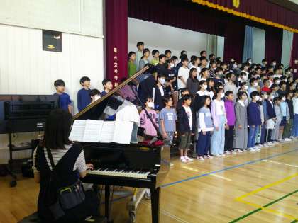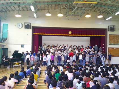 体育館では、2、4、6年生の音楽朝会を行いました。6年生による発表です。「雨のうた」のリコーダー合奏、「believe」の合唱を披露してくれました。リコーダーもきれいなハーモニーでしたし、声変わりが始まった6年生ですので、1オクターブ下で歌う子もいます。音の厚みが出て迫力のあるとても素晴らしい歌声でした。聴いていた下級生も「2年生はまだリコーダーはやったことないけれど、6年生になるとこんなに上達するんだな。と思いました。」「とても素晴らしかった。」などの感想を話してくれました。上級生に憧れて自分もそうなりたい!と思うことはまさにキャリア教育です。6年生のみなさん、すてきな合奏、合唱をありがとうございました。