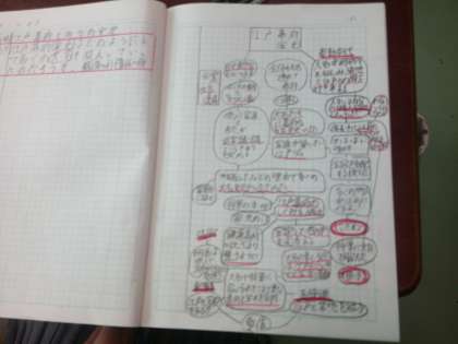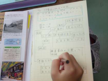 歴史の学習をしている6年生。「江戸幕府はどのようにして260年も続く世の中を築いたのだろうか。」という学習問題の中で、今日は「江戸幕府(家光)はどのようにして多くの大名を従えていったのだろうか。」をテーマに調べたり、意見を出し合ったりしました。ノートには箇条書きでまとめるのではなく、概念図としてまとめ、考えを整理することができました。